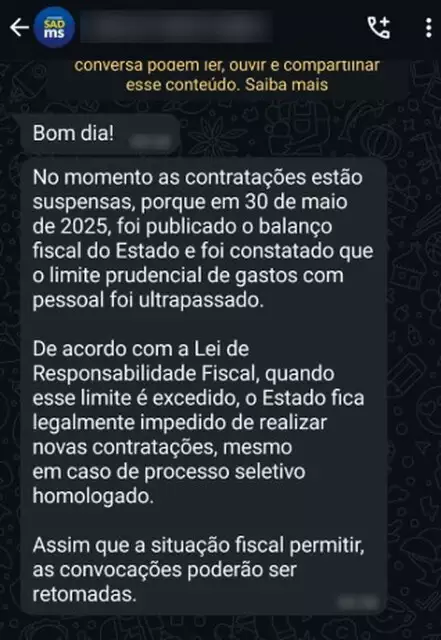 Informação da SAD-MS a respeito da suspensão temporária de contratações. Foto: ReproduçãoAs contratações previstas em processo seletivo da Fertel (Fundação Estadual Jornalista Luiz Chagas de Rádio e TV Educativa de Mato Grosso do Sul) foram as primeiras a serem temporariamente suspensas. A informação foi divulgada ao participante pela SAD (Secretaria de Estado de Administração), que justificou a paralisação com base no balanço fiscal do Estado.