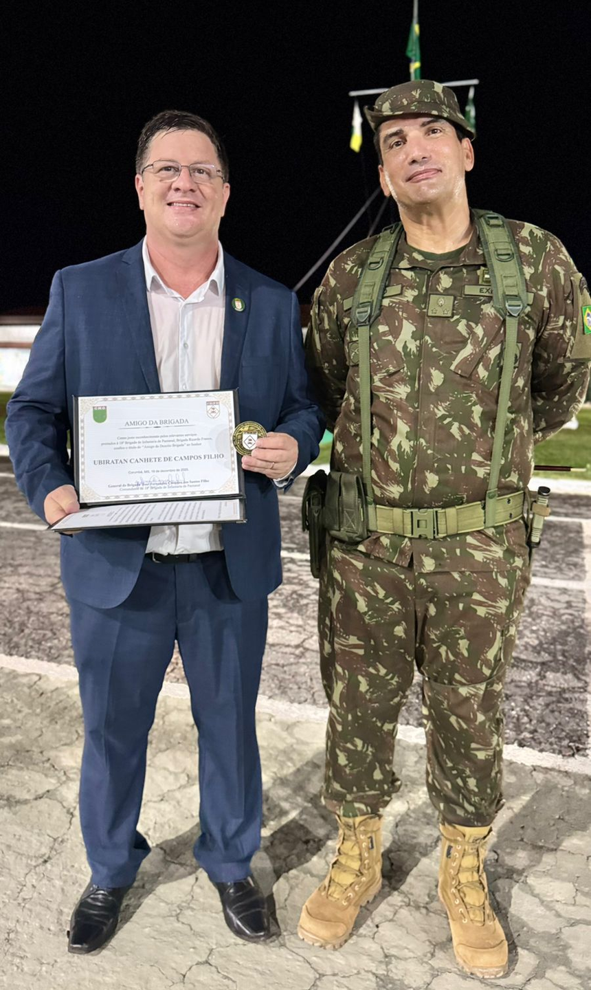Na noite de sexta-feira (19), o vereador e presidente da Câmara Municipal de Corumbá, Ubiratan Canhete de Campos Filho (Bira), recebeu o título Amigo da Brigada, concedido pela 18ª Brigada de Infantaria do Pantanal, das mãos do General de Brigada José Fernandes Carneiro dos Santos Filho. O reconhecimento representa um momento de grande alegria e satisfação, reforçando a relação institucional, cordial e respeitosa entre a Câmara Municipal e o Exército Brasileiro.