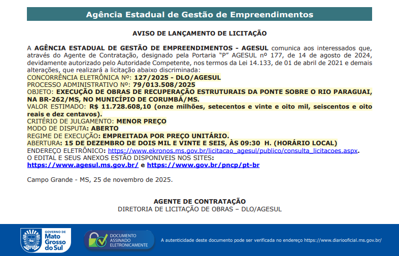 A Agesul (Agência Estadual de Gestão de Empreendimentos) publicou no Diário Oficial de Mato Grosso do Sul (MS), nesta quarta-feira (26), o aviso de lançamento da licitação para execução das obras de recuperação estrutural da ponte sobre o Rio Paraguai, na BR-262, em Corumbá. O procedimento corresponde à Concorrência Eletrônica nº 127/2025, que será realizado pelo critério de menor preço, em modo de disputa aberto, no regime de empreitada por preço unitário. A sessão de abertura está marcada para o dia 15 de dezembro, às 9h30, no portal eletrônico da Agesul. O valor estimado é de R$ 11.728.608,10. O edital completo está disponível nos sites da Agesul, do Governo do Estado e do PNCP.