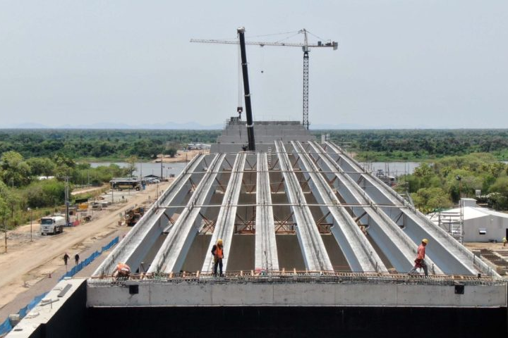 A construção da ponte que liga Porto Murtinho (MS) e a Carmelo Peralta (Paraguai), principal obra da Rota Bioceânica, é o trecho mais avançado, com 82% concluído. (Foto: Toninho Ruiz)