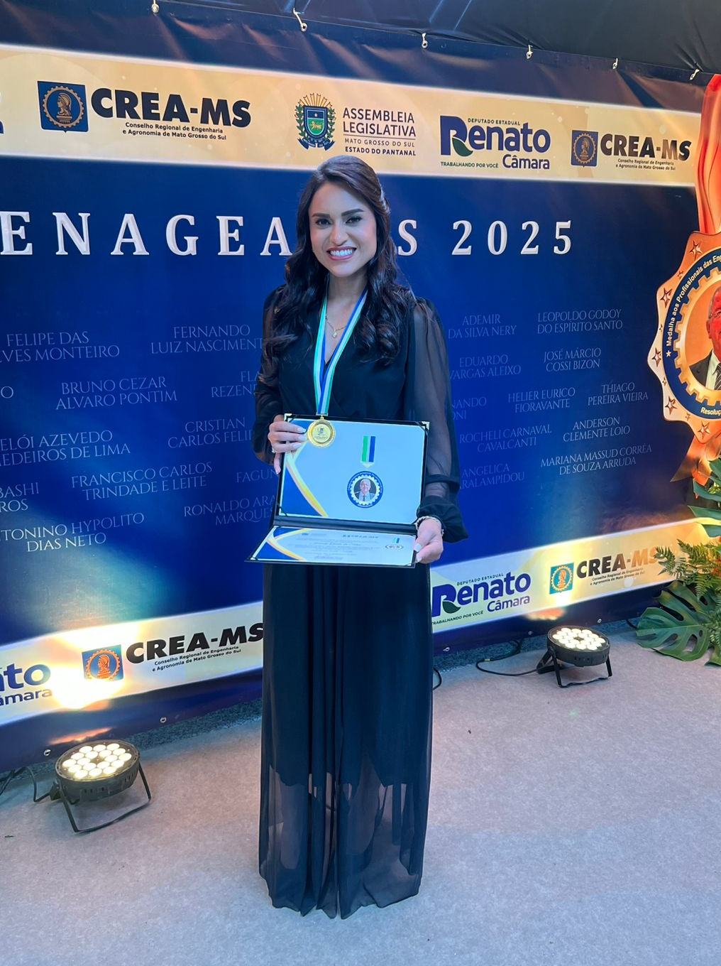 A honraria, considerada a mais alta distinção concedida pelo Crea-MS em parceria com o Parlamento estadual, reconhece profissionais que se destacam por sua dedicação, ética e contribuição ao desenvolvimento da Engenharia, Agronomia e Geociências. Neste ano, apenas 35 profissionais foram selecionados em todo o Estado — e Jossiely esteve entre os nomes indicados pela presidente do Crea-MS, Vânia Mello.
