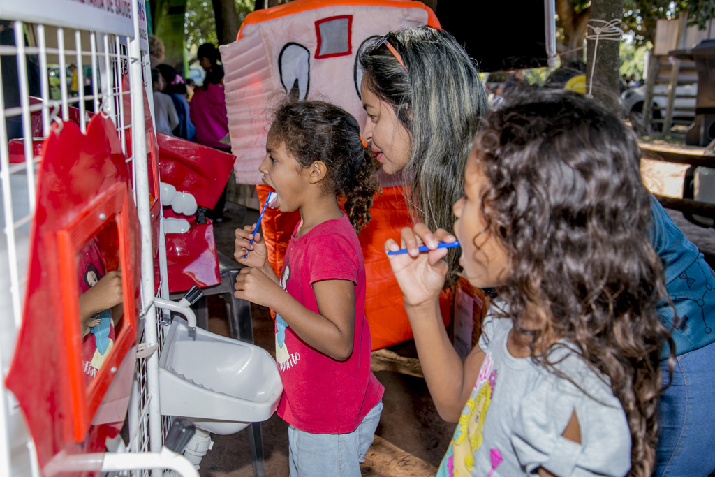 As crianças aprenderam sobre saúde bucal e ganharam kits de higienização. Foto: Renê Marcio Carneiro/PMCA programação incluiu ainda atividades esportivas e atendimentos de cidadania, com corte de cabelo, maquiagem, esmaltação, alistamento militar e cadastramento em programas sociais como o CadÚnico e o ID Jovem. Orientações jurídicas e educacionais também estiveram disponíveis, reforçando o caráter multidisciplinar da ação.