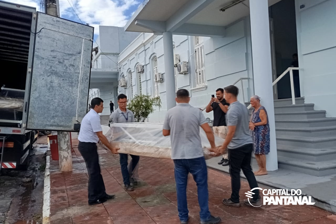 Camas hospitalares sendo descarregadas de caminhão da Andorinha. Foto: Capital do PantanalO presidente da Santa Casa, Afonso Severino da Silva, agradeceu o apoio e destacou que as doações possuem grande importância. "Essa doação será usada no momento em que as pessoas mais precisam de conforto, quando estão hospitalizadas e em recuperação. Eu agradeço a toda equipe da Andorinha porque caminhando juntos, o quem prevalece é a vida", disse.