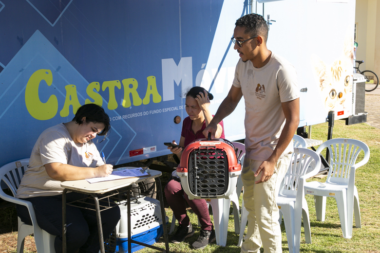 O prefeito, Dr. Gabriel, acompanhou o inicio do trabalho no Castramóvel. Foto: Ayrton Benites/PMCDe acordo com a diretora-presidente da Fundação de Meio Ambiente, a fila de espera inclui animais cadastrados em anos anteriores, refletindo uma demanda represada.