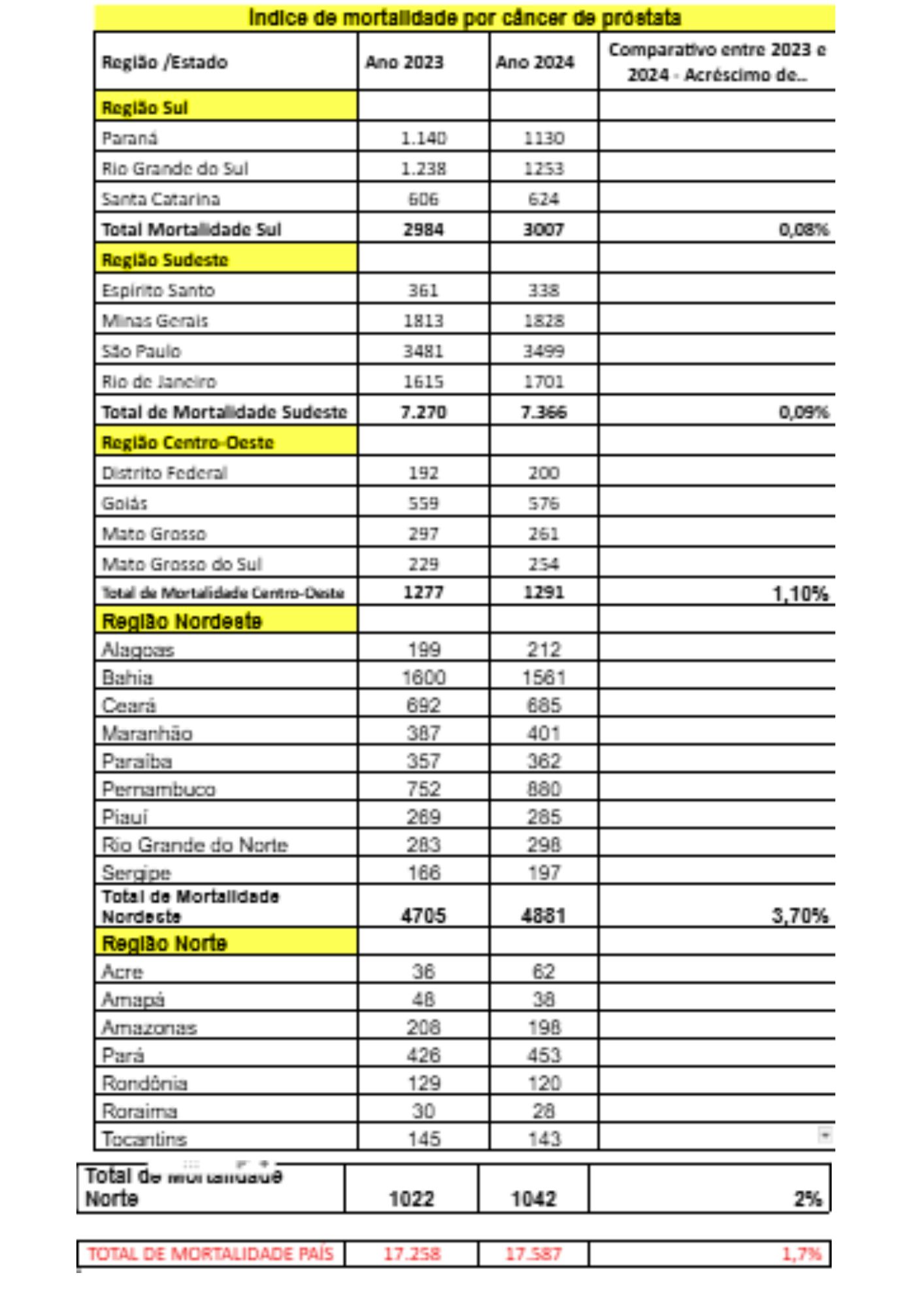 A maior incidência é esperada na região Sudeste (77,9 casos por 100 mil homens), seguida do Nordeste (73,3), Centro-Oeste (61,6), Sul (57,2) e Norte (28,4). No entanto, as taxas de mortalidade são maiores no Norte e Nordeste, demonstrando um diagnóstico mais tardio nessas regiões. Segundo dados do Instituto Nacional de Câncer (INCA), o Brasil registrou 17.258 óbitos por câncer de próstata em 2023 e 17.587 em 2024, representando um aumento de aproximadamente 2%. Mato Grosso do Sul concentra 254 dos 1.291 óbitos por câncer de próstata registrados na região Centro-Oeste em 2024. A doença é a segunda principal causa de morte entre os homens, perdendo apenas para o câncer de pulmão. Confira, a seguir, a tabela por estado.